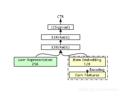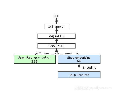 上述四个任务是网络中需要学习用户表达的任务,可同时进行学习得到任务模型,从而得到最终的用户表达。那么接下来需要验证最终的用户表达是否可以应用到其他任务中,因此设置了transfer task。transfer task用来预估用户的店铺偏好,但是该任务并非和上述四个任务同时学习,而是取上述四个任务学习之后的用户表达进行学习,验证其是否可以直接使用在新任务中。因此相比其他四个任务需要链接到一个较大的网络背景下进行,transfer task的深度较浅。