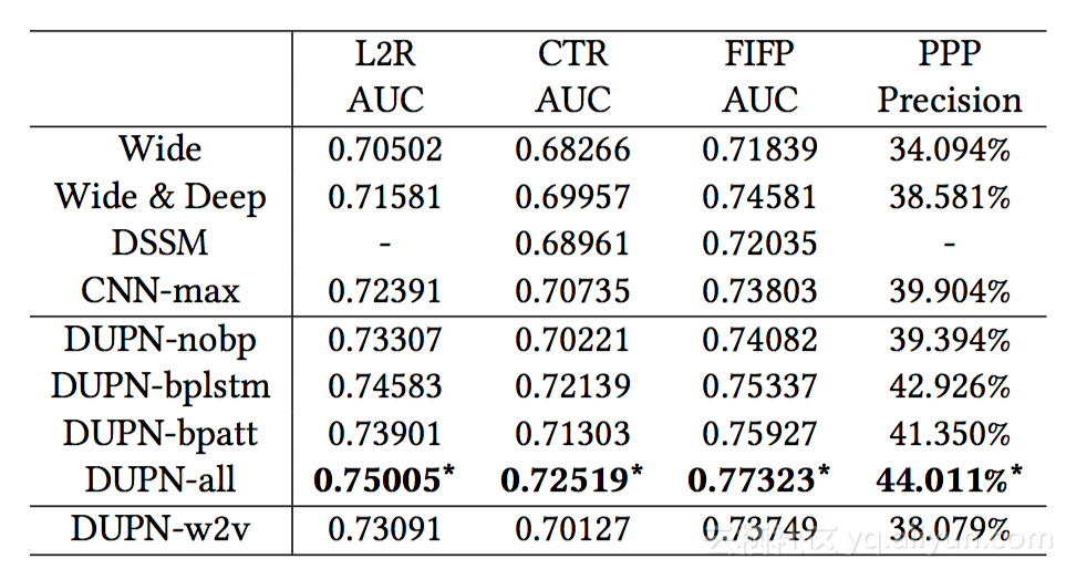 首先分析第一组实验结果。第一组实验将上述提出的方法(命名为DUPN),与其他Baselines方法(包括Wide, Wide & Deep, DSSM, CNN-max四种)进行比较。Wide方法是单层网络,可能会包含较多的单特征和交叉特征,然后进行逻辑回归LR(logistic regression)。第二和第三种方法分别是由Google提出的Wide & Deep,以及由微软提出的DSSM。最后CNN-max是采用CNN提取用户行为特征,然后做max-pooling,得到用户表达。而上文中提出的DUPN方法包含5个子方法,DUPN-nobp/bplstm/bpatt/all/w2v。DUPN-nobp/bplstm/bpatt这三种子方法是指用户行为描述property只使用在LSTM或Attention Net中。DUPN-all表示最完整的算法。DUPN-w2v表示并不使用end to end学习方式,而是加入pre-training,采用word to vector将每个商品训练为向量形式,然后直接将该向量输入到后续的网络中,这样可以大大减小网络的参数空间。接下来将这些方法应用到任务1-4中,得到以下的结果对比: