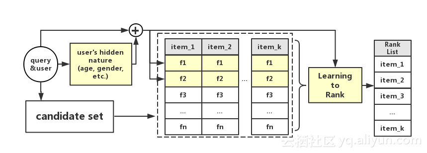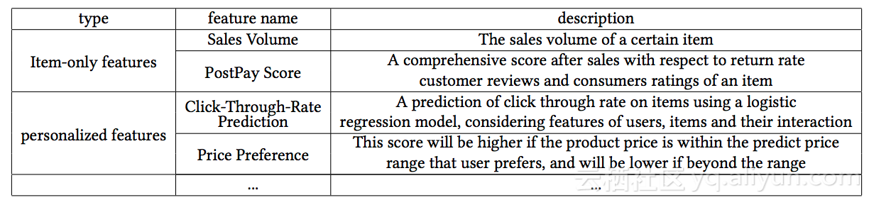 首先,用户会输入一个查询(query),然后搜索引擎会根据倒排索引,返回一个相关的候选集合。同时也会设置预测任务获得用户的相关信息,比如性别、年龄、购买力、购买风格、购买偏好等。基于候选集和用户信息,可以获取候选集中的所有商品的属性和特征,如下表所示: