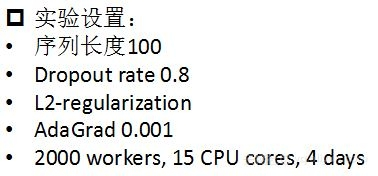 下图列出了实验中的一些参数。例如LSTM的用户序列为100个,Dropout rate为0.8,采用L2正则,AdaGrad中的learning rate为0.001,训练使用分布式的TensorFlow环境,其中有2000个worker,96个server,15个CPU核,没有使用GPU,整个训练需要4天来完成。