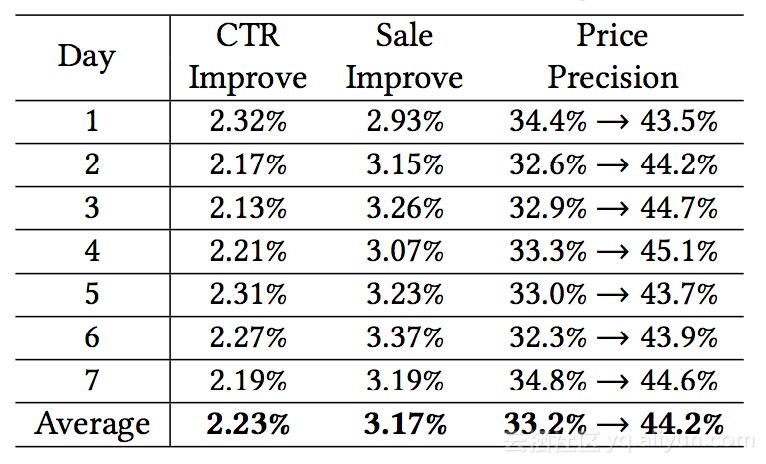 最后将这个算法应用到淘宝的一个在线系统,现在已全面生效。淘宝统计了其在线上7天内的运行效果,如下表所示,CTR可以提升2%左右,销量可以提升3%左右,购买力预估从以前的33%提升到44%。