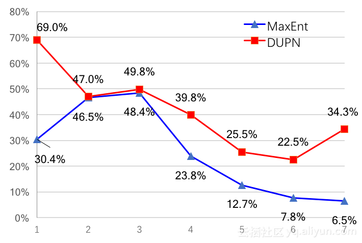 以下两图更详细的展示了算法的效率提升。淘宝上用户的购买力分为7分,因此这里需要观察每个分档下的准确率(上图)和召回率(下图)。由图可见,准确率和召回率都有提升,但提升的幅度并不一致。在准确率中,1档和7档提升较多,而23档提升较少。在召回率中,各档提升较为均匀,大致在5%至10%之间。