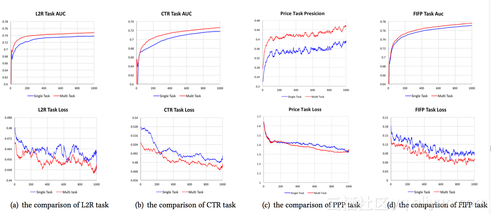 上方四张图为各任务在两种情况下AUC的比较值,下方四张图为Loss的下降情况。以第一张图L2R Rank AUC为例,首先关注AUC的变化趋势。开始阶段AUC值会飞快的增长到0.68左右,然后增长速度放缓直到0.75。因为抽取的用户特征中会存在一些泛化特征,这些泛化特征在每个样本中都存在,开始阶段泛化特征会起到主要作用,学习速度较快。但是对于后续稀疏的特征,例如店铺特征或商品ID等,学习速度非常慢,但依然可以使AUC值逐渐上涨。而图中红色曲线为多任务学习结果,蓝色曲线为单任务学习。这里可以清晰的看到在所有图像中,多任务学习的AUC和准确度都高于单任务学习。那么该如何理解这种现象呢?大家可能会猜想由于多任务同时学习会使某些任务学习速度降低,然而并不如此。在四个任务同时进行时,可以将其他三个任务看成正则,例如在学习时加入L2正则,会使AUC值更高。但这三个任务与L2正则的差异是他们并不只是单纯的防止过拟合,同时也可以使基础特征学习的更加泛化。因此多任务学习其实对每个单任务来说都会更加有利,AUC值也会更高。
