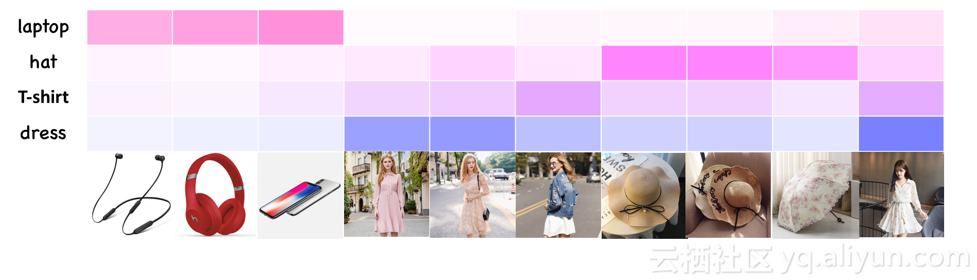 然后从两方面对用户的attention进行分析。一方面是用户输入的query信息,如下图所示。最下一行是用户在淘宝上曾经有相关行为的商品,从左向右行为时间越近。那么用户再次输入不同的query,对这些历史行为的attention也不同,颜色深浅代表attention的大小。例如当用户再次搜索laptop时, 那么attention更多的会集中在耳机、手机之类,而搜索连衣裙T恤之类,服饰相关的类目会起到比较大的作用。由此可见,query能够非常有效的决定历史行为的重要性程度。
