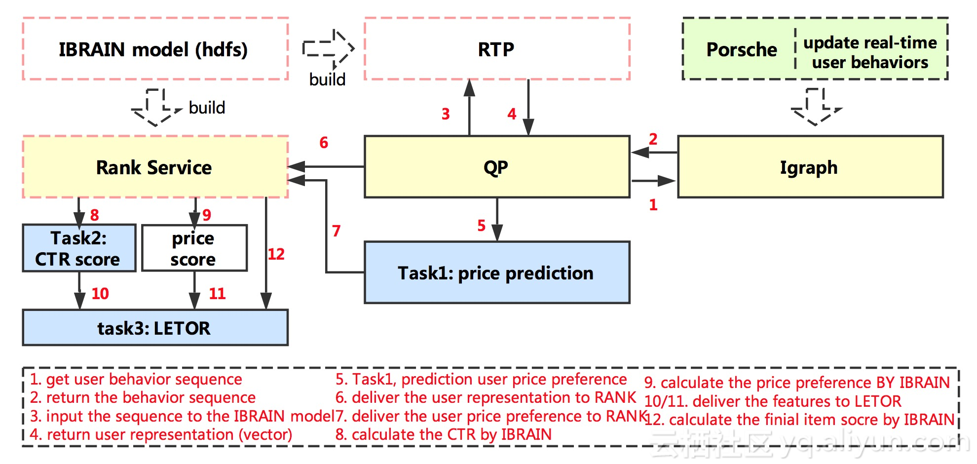 与商品相关的特征有销量、售后满意度等,个性化特征包括商品的个性化预估、用户对该商品的价格偏好等。对于某一商品,可能有几十维或者上百维的特征描述,接着使用模型整合这些特征的单个评分,最后根据总得分进行排序。流程图中黄色的部分为商品个性化相关的部分,即需要模型去预估的部分。每个黄色块可以看作是一个任务或多个任务。由此可见,在线排序过程中通常存在多个任务,因此需要使用多任务表达学习来解决。
