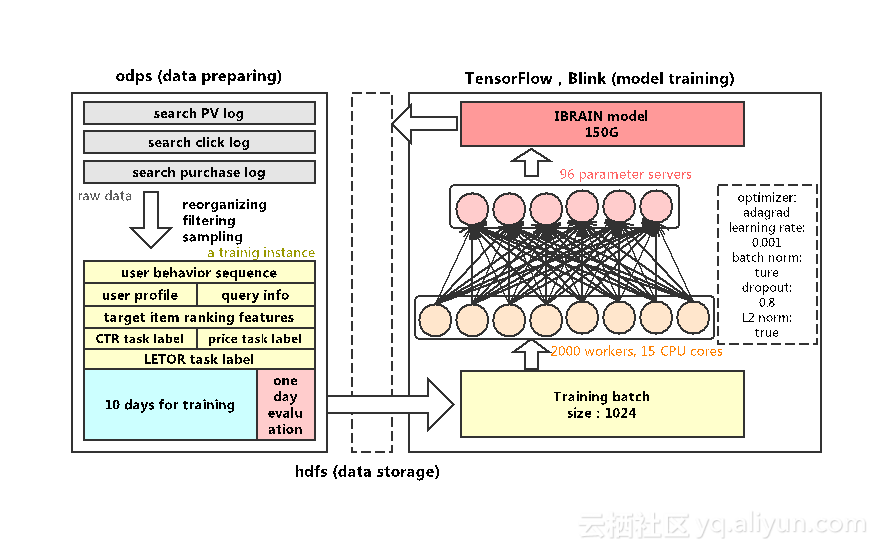 后续是模型生效过程,因为这些过程和淘宝相关性太高,只做一个简单介绍,如下图所示。首先通过OPDS将用户的点击、购买和PV行为合并,10天做训练,一天做评估,然后将这些数据放在HDFS,在TensorFlow上进行训练。这样一个模型大约在150G左右。因此当模型数增多,至五个以上时,线上内存是无法容纳的。这也是采用多任务学习的一个重要原因,来减小模型的存储和计算效率。