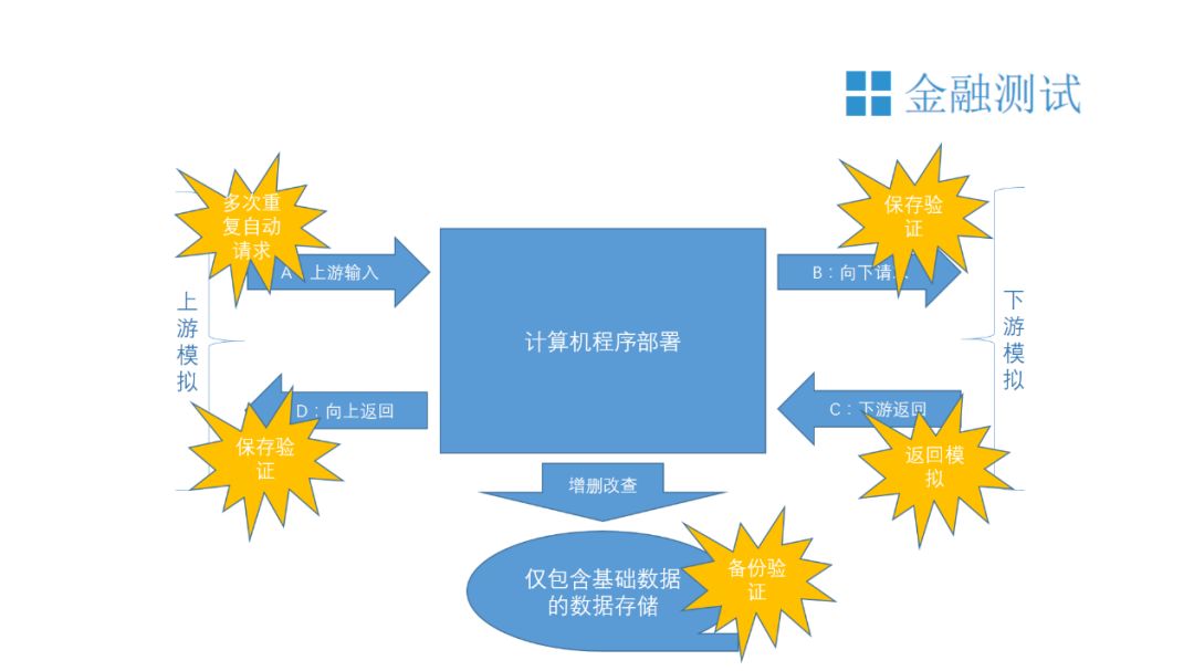 首先,在这个模拟过程中,平台会保存B点向下请求的数据,以作为对A-B之间应用程序的验证数据。再次,平台会对D点向上返回的数据进行保存,以作为对C-D之间应用程序的验证。另外,应用程序运行过程中的数据存储我们也将保存并加以验证。