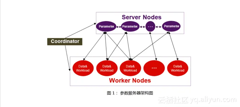 首先介绍一下Parameter Server结构,它包括三个部分,分别是Server、Coordinator和Worker,如下图所示:
