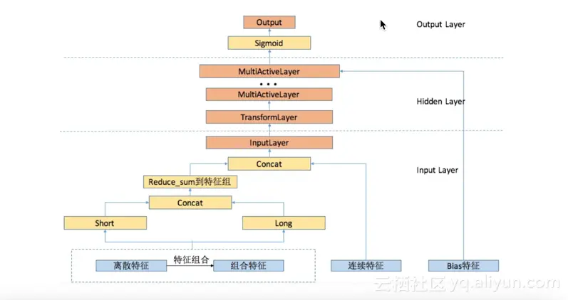 从下面的直观图中可以看到整个XNN算法的体系结构。XNN算法的底层是一些离散特征和组合特征,形成了每个特征或长或短的embedding,长的embedding会分为二维、四维、八维和十六维,这些特征concatenate在一起并且做group级别的Reduce_sum,然后再与其他特征组和连续特征比如点击率等concatenate在一起做联合训练,结合在一起的这些特征会被传入输入层进行转化,这种转化的目的是将特征均匀化和标准化,逐层上传到最上层后经过sigmoid激活函数处理后输出。另外会有一些blas特征(用户在翻页时的页面信息)放在上层,因为通过日常测试会发现此类特征放于XNN算法的底层其效果并不理想。