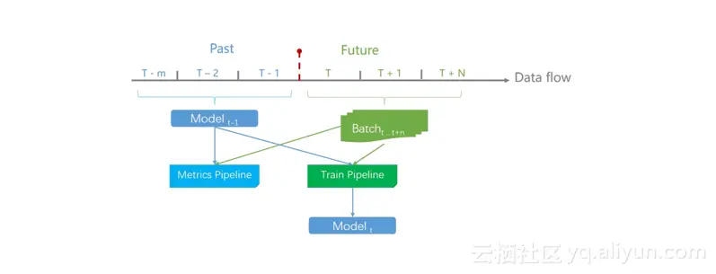 对于T-1时刻的模型,基于流式评估会计算其在T到T+N时刻的数据流的评价指标。这些评价指标包括AUC、PCOPC、MAE和RMSE,其中PCOPC是指整个场景的预估准确率和真实准确率的比值,它代表了机器学习任务的偏度。例如点击率为0.5,若预估值为0.6,则预估偏高;相反,若预估值为0.4,则预估偏低。在训练时,用户通过PCOPC指标可以发现之前的一些算法的预估值偏度存在一定的问题,而在流式评估模式下,用户可以在调参的时候很快地发现这些问题。与此同时,流式评估模式会统计诸如正样本数、负样本数和模型规模等指标,从而帮助用户在整个学习过程中可以方便地进行模型的裁剪以及整个场景中样本的监控。