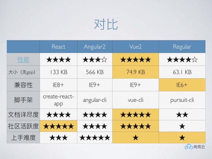 - 文档完善性(Webpack+Vue+PostCSS > NEJ+Regular+MCSS)