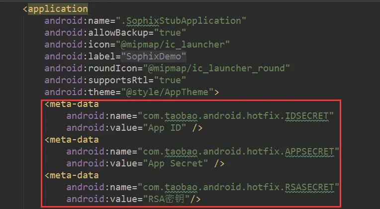 将上述value中的值分别改为通过阿里平台HotFix服务申请得到的APP ID、App Secret和RSA密钥(这三个东西是在阿里云平台创建应用后才能看到,可以等注册平台创建应用后,再来填写),出于安全考虑,也可以使用setSecretMetaData这个方法进行设置,后续配置会讲到这个方法。