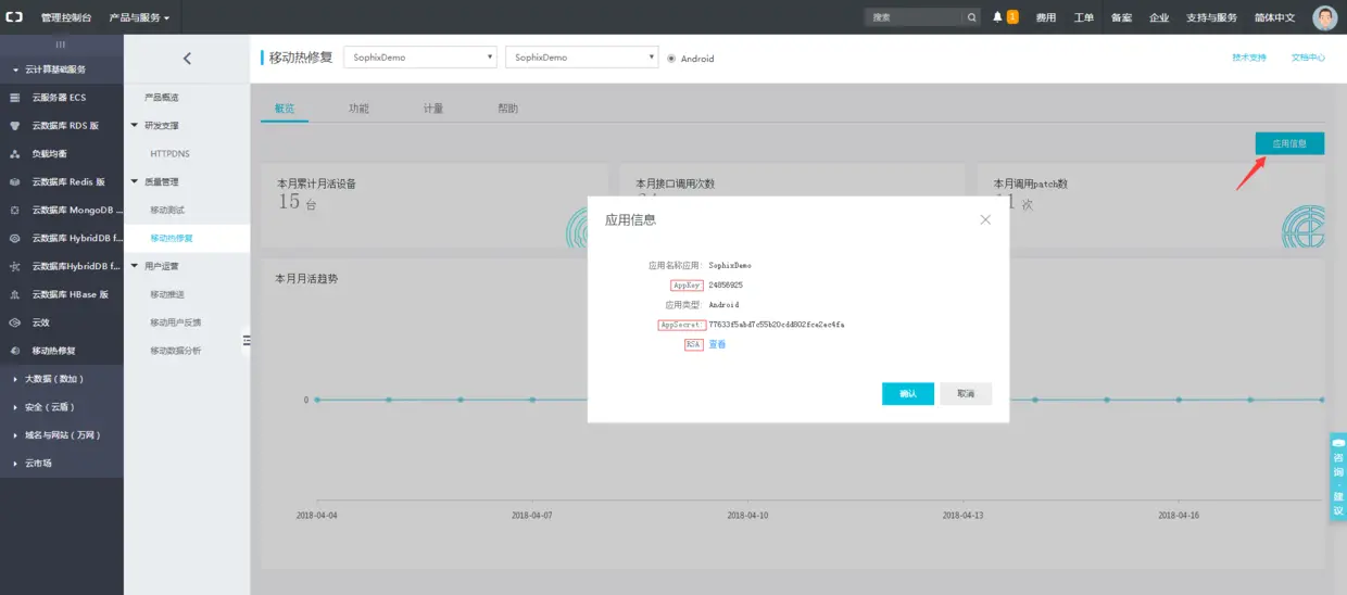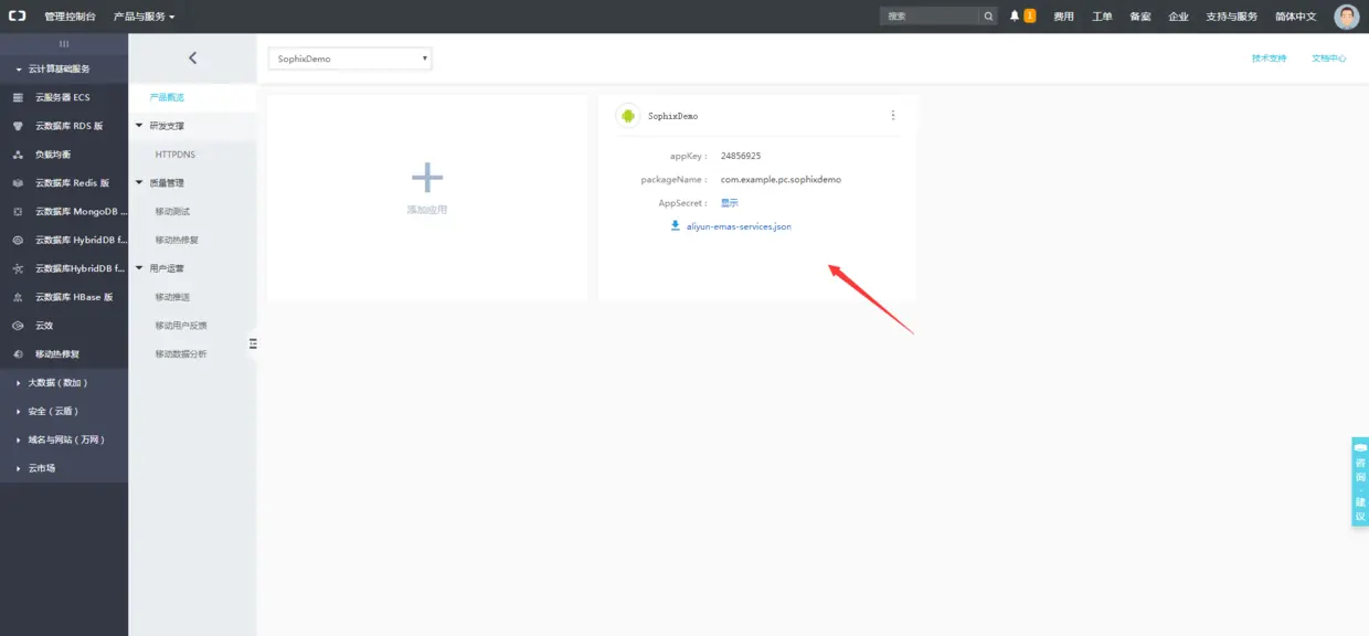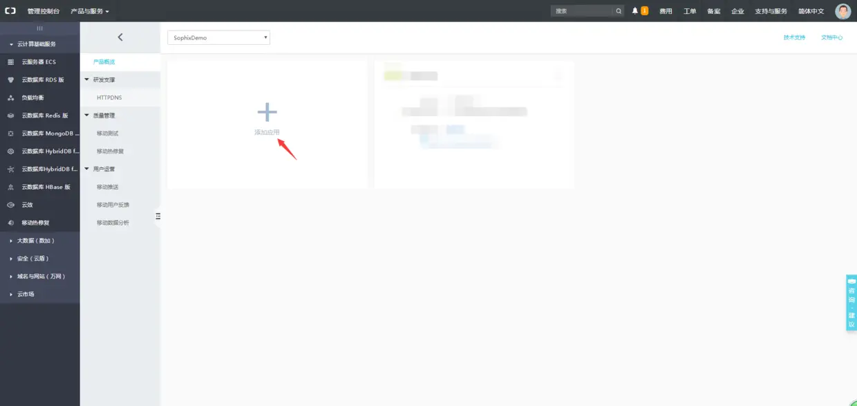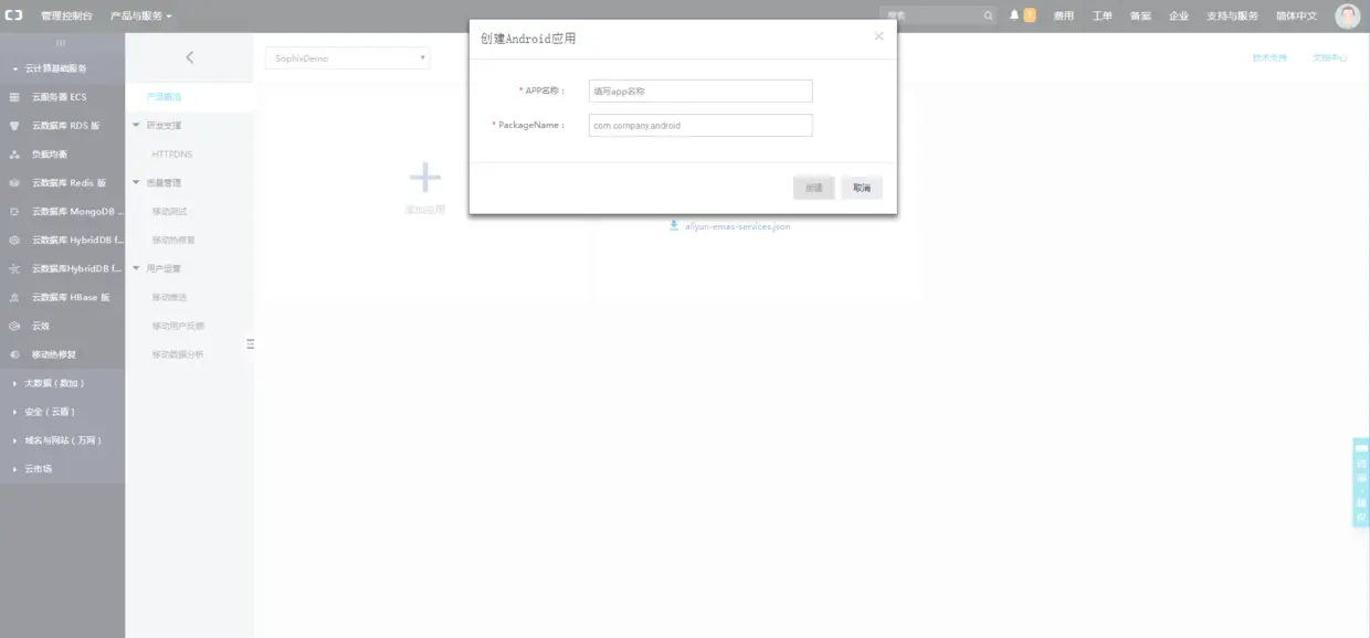 Sophix热修复是在阿里云移动研发平台上的,他为用户提供一个可视化控制台,用起来比较直观简便。由于官方文档里有部分图片与现在平台呈现的不一致,所以我将创建应用发布补丁等图都截了下来。接下来内容图片有点多,看得懂官方文档的可以跳过这一节。