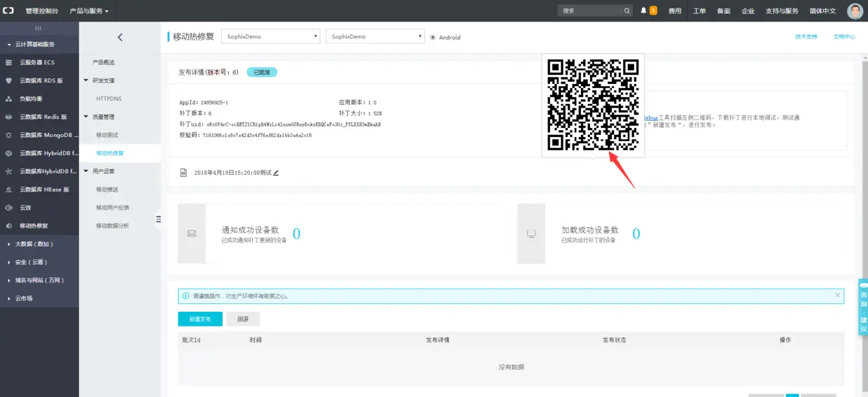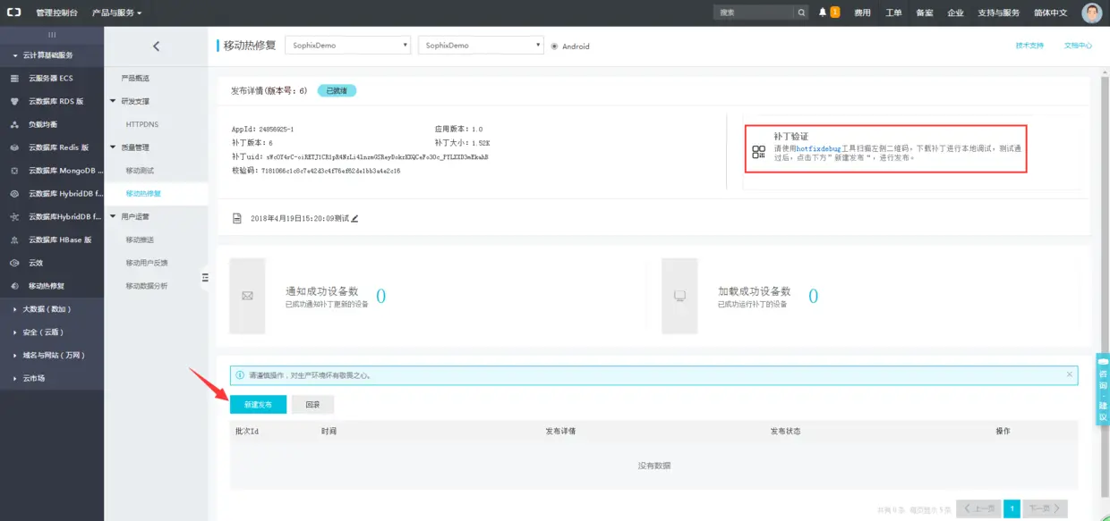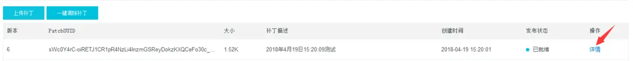 点击详情,可以看到右上角有个补丁验证,在新建发布前,我们一定要先自己测试下热修复是否成功。这里需要用官方提供的调试工具来测试,具体操作可以看官方的调试补丁章节。