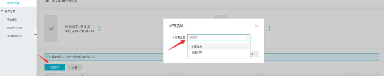 调试无误后,就可以新建发布了,发布主要有两种类型:灰度发布和全量发布,灰度发布可以限定人数。官方要求发布前请严格按照:扫码内测 => 灰度发布 => 全量发布的流程进行,以保证补丁包能够正常在所有Android版本的机型上生效。