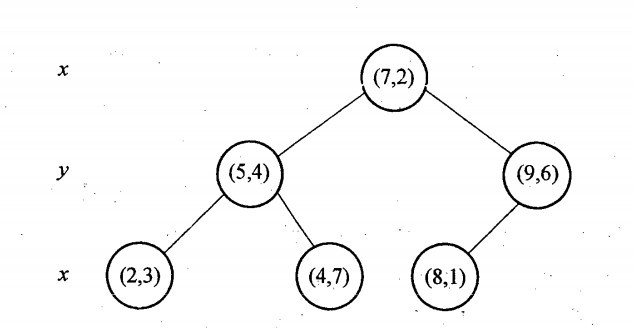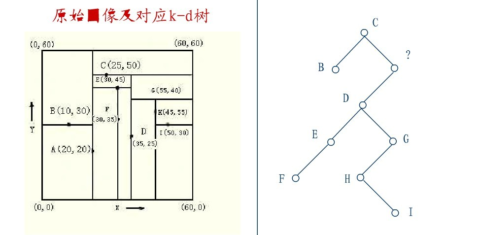 - 确定:左子空间和右子空间。具体是:分割超平面x=7将整个空间分为两部分:x<=7的部分为左子空间,包含3个节点={(2,3),(5,4),(4,7)};另一部分为右子空间,包含2个节点={(9,6),(8,1)};