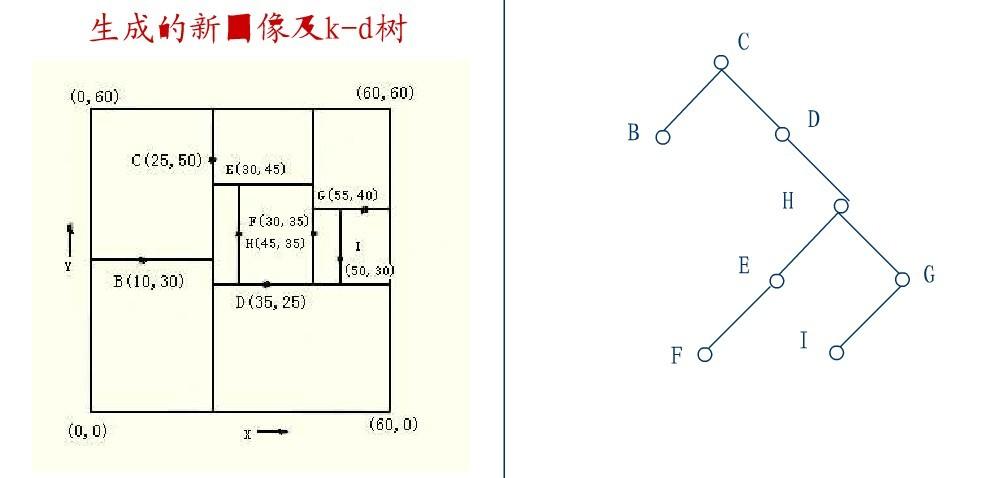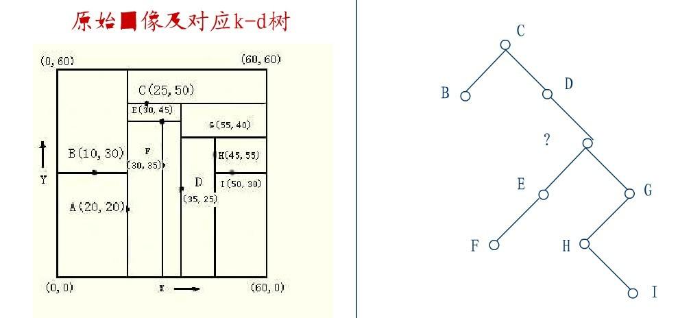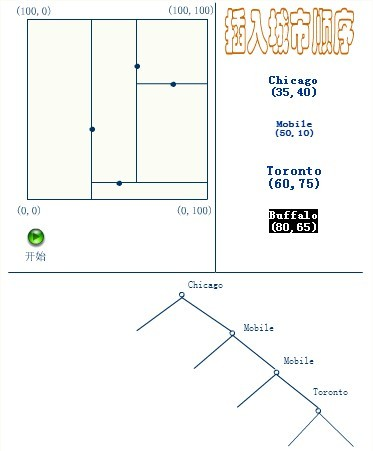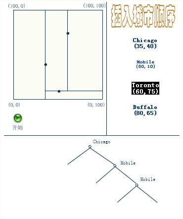 应该清楚,这里描述的插入过程中,每个结点将其所在的平面分割成两部分。因比,Chicago 将平面上所有结点分成两部分,一部分所有的结点x坐标值小于35,另一部分结点的x坐标值大于或等于35。同样Mobile将所有x坐标值大于35的结点以分成两部分,一部分结点的Y坐标值是小于10,另一部分结点的Y坐标值大于或等于10。后面的Toronto、Buffalo也按照一分为二的规则继续划分。