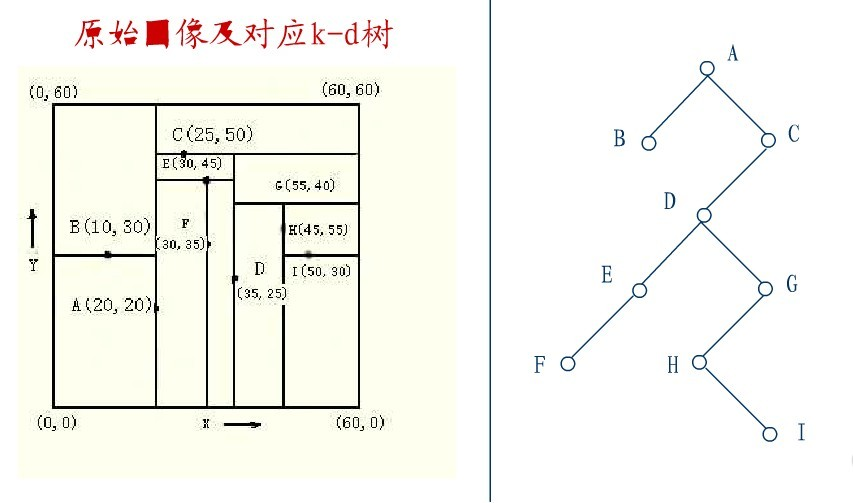也就是说,如之前所述,kd树中,kd代表k-dimension,每个节点即为一个k维的点。每个非叶节点可以想象为一个分割超平面,用垂直于坐标轴的超平面将空间分为两个部分,这样递归的从根节点不停的划分,直到没有实例为止。经典的构造k-d tree的规则如下: