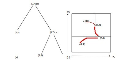 与此同时,经过对上面所示的空间划分之后,我们可以看出,点(7,2)可以为根结点,从根结点出发的两条红粗斜线指向的(5,4)和(9,6)则为根结点的左右子结点,而(2,3),(4,7)则为(5,4)的左右孩子(通过两条细红斜线相连),最后,(8,1)为(9,6)的左孩子(通过细红斜线相连)。如此,便形成了下面这样一棵k-d树: