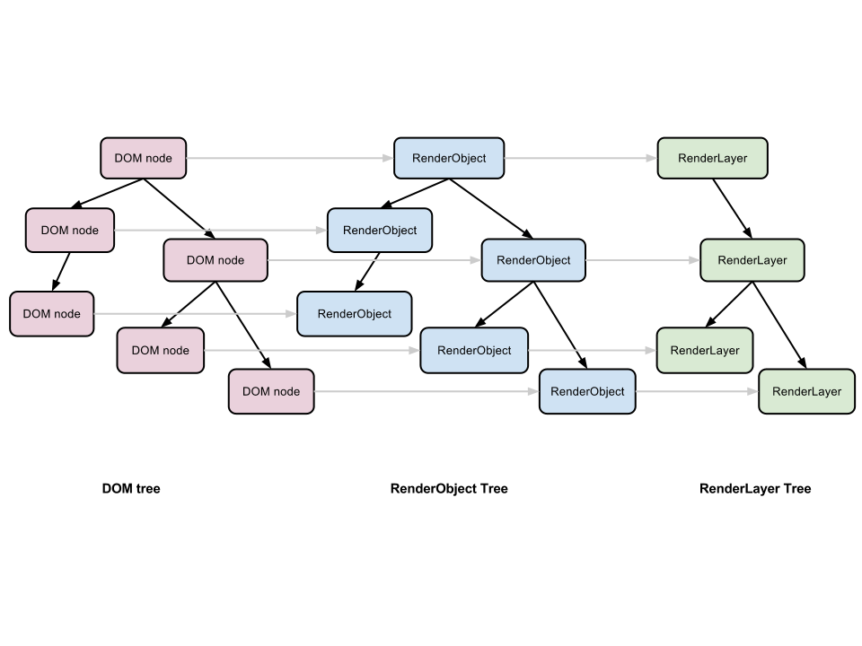 不过浏览器渲染引擎并不是直接使用 Render 树进行绘制,为了方便处理 Positioning(定位),Clipping(裁剪),Overflow-scroll(页內滚动),CSS Transform/Opacity/Animation/Filter,Mask or Reflection,Z-indexing(Z排序)等,浏览器需要生成另外一棵树 - Layer 树。渲染引擎会为一些特定的 RenderObject 生成对应的 RenderLayer,而这些特定的 RenderObject 跟对应的 RenderLayer 就是直属的关系,相应的,它们的子节点如果没有对应的 RenderLayer,就从属于父节点的 RenderLayer。最终,每一个 RenderObject 都会直接或者间接地从属于一个 RenderLayer。