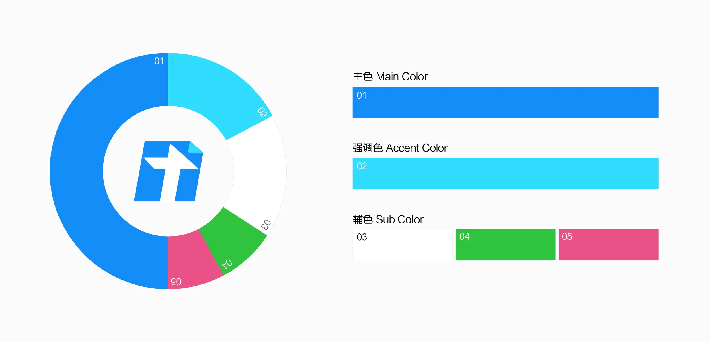 为打造腾讯文档专业可靠的品牌形象,蓝色为主色。强调色使用明快的蓝色,白色的配搭使品牌更大气高端。主蓝色、绿色、玫红色分别运用在子品牌在线文档、在线表格、在线幻灯片(幻灯片未发布)。