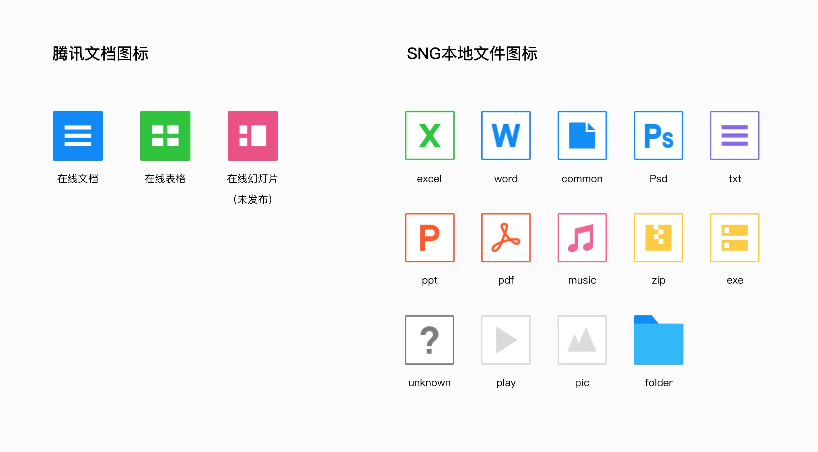 腾讯文档的图标,通过极简的造型及鲜明的彩色,将信息传达给用户,并且呈现轻松的办公感受。同时此次品牌建设对办公类文件图标进行了系统性的统一设计,全新的在线及本地图标将应用至腾讯文档/TIM/QQ各端。