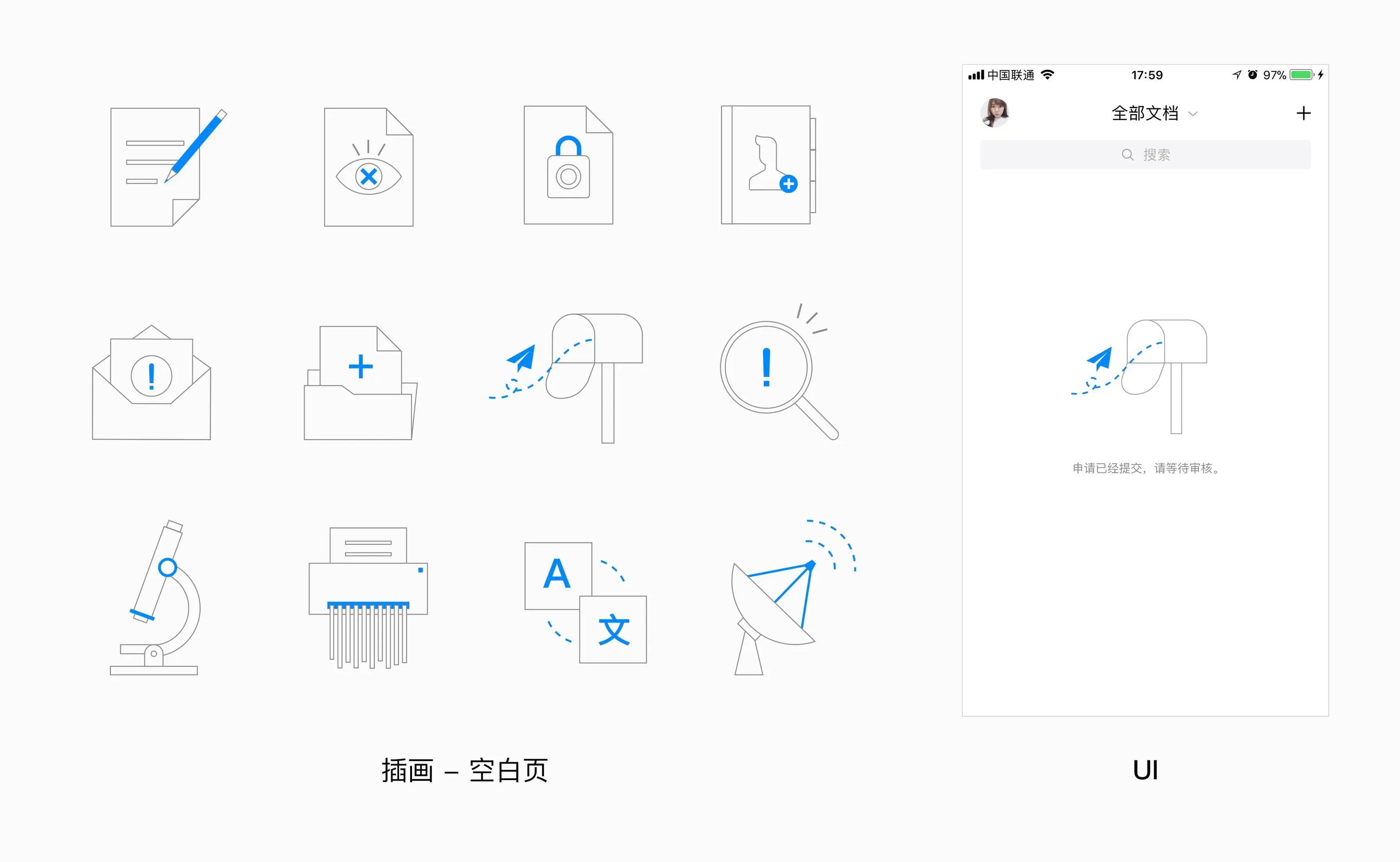 空白页是暗示用户缺失的场景,因此图形呈现不能太强眼。整体使用灰色描边,强调内容使用品牌蓝点缀。蓝色在灰色线条中带来新鲜感,也强调品牌感。