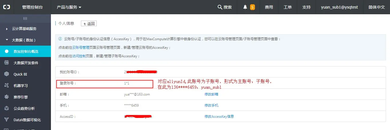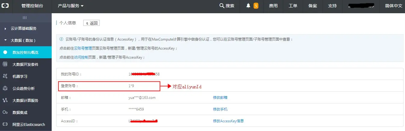 如果使用的是主账号,aliyunId 为DATAIDE登录时使用的阿里云账号,如下图红框中的登录账号:
