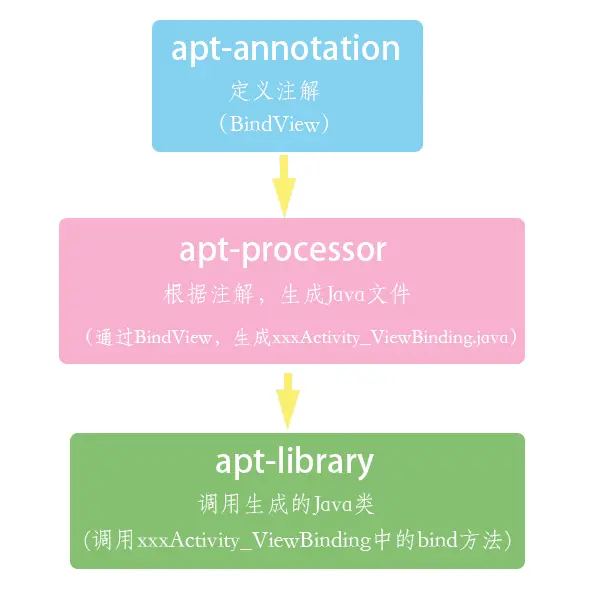 apt-processor:注解处理器,根据apt-annotation中的注解,在编译期生成xxxActivity_ViewBinding.java代码 -