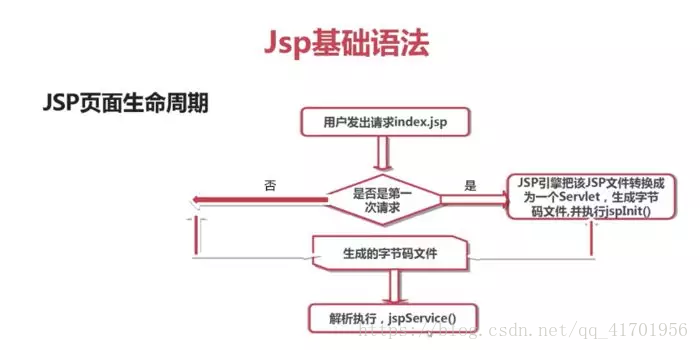 ①如果是第一次请求,那么Tomcat的JSP引擎就把这个JSP文件转换成一个Servlet(一个Servlet从本质上而言也是一个Java类),既然是一个Java类就需要通过编译,生成相应的字节码文件,然后执行jspInit这个初始化方法。再生成JSP页面的字节码文件,转到③。