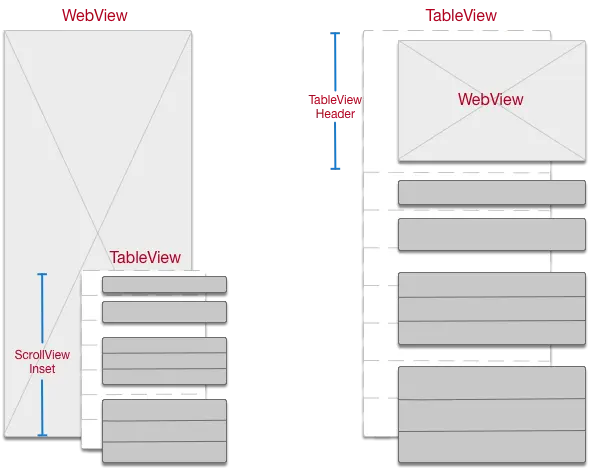同时无论使用哪种方式和WebView衔接,都影响了WebView、TableView的独立渲染展示,增加了维护的困难。并且Header与Inset对于头部区域的扩展,如下拉刷新等,实现都较为困难。