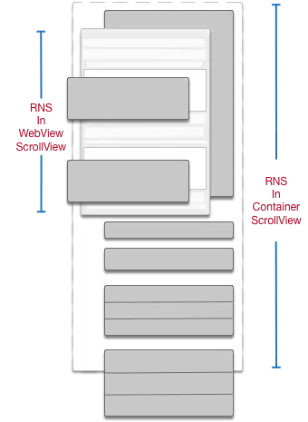 这种实现用一个ScrollView作为Container,将WebView及扩展区的组件分别作为SubView。全部SubView禁止滚动,内容页的全部滚动都发生在Container上。对于SubView中的滚动视图,如果ContentSize小于屏幕高度,则作为普通View,否则设置为屏幕高度,通过offset和Frame的计算,动态的调整视图相对Container的Frame以及自身的ContentOffset,实现滚动效果。