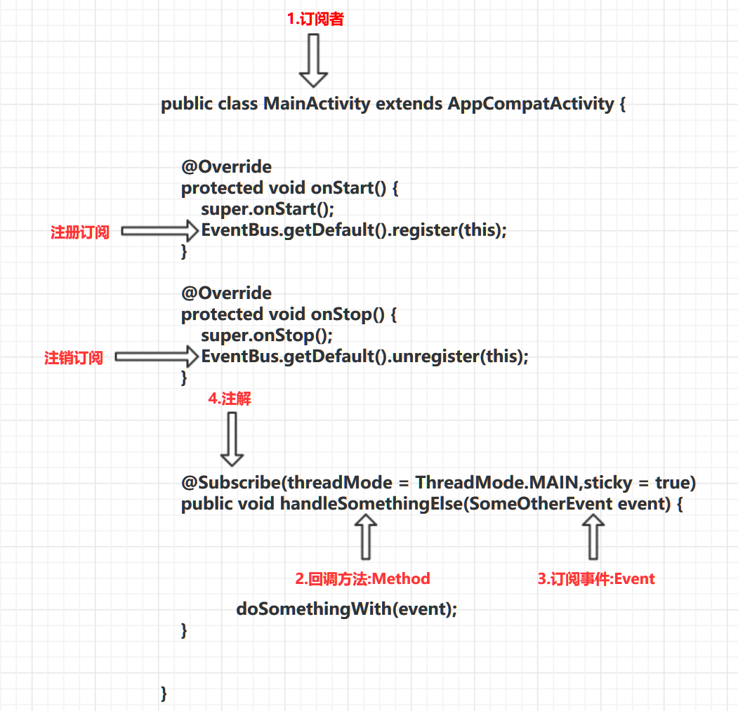第二步:回调方法.回调方法要求1.public类型修饰的 2.方法参数只能有一个 3.使用@Subscribe修饰