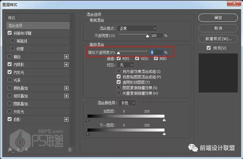 步骤3: 双击文字打开文字图层样式,设置混合选项,把填充不透明度设为0%。