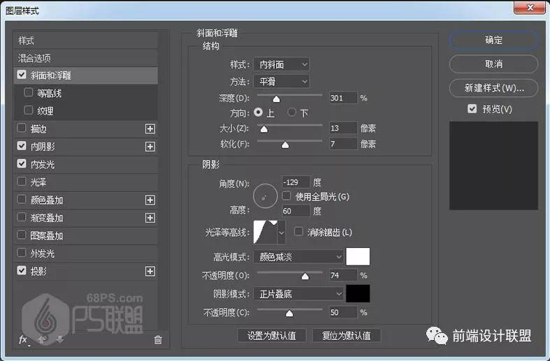 样式:内斜面 方法:平滑 深度:301 大小:13像素 软化:7像素 角度:-129 高度:60 高光模式:颜色减淡,不透明度74%,#ffffff 阴影模式:正片叠底,不透明度50%,#000000