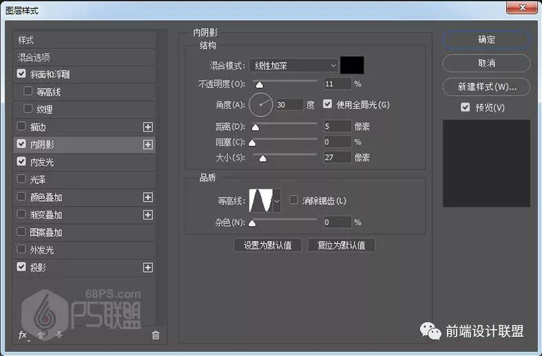 混合模式:线性加深#000000 不透明度:11% 角度:30,使用全局光 距离:5像素 大小:27像素 等高线:环形