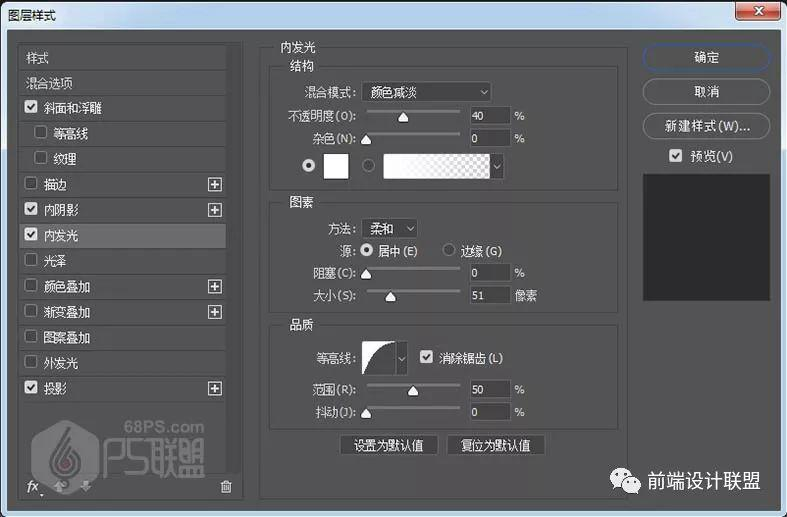 混合模式:颜色减淡 不透明度:40% #ffffff 源:居中 大小:51 等高线:半圆 范围:50%