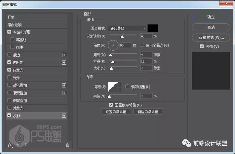 混合模式:正片叠底,#000000 不透明度:46% 角度:90 距离:4像素 扩展:12% 大小:7像素 等高线:画圆