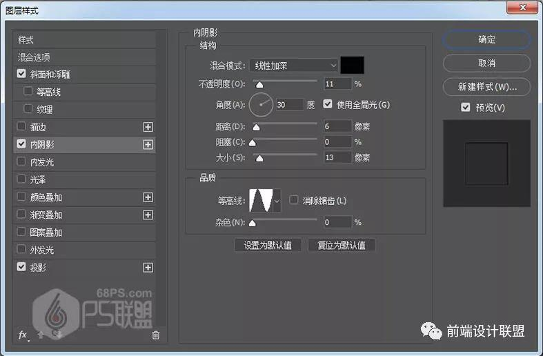 混合模式:线性加深#000000 不透明度:11% 角度:30,使用全局光 距离:6像素 大小:13像素 等高线:环形