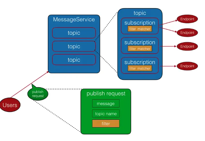 MaxCompute消息服务包含四个基本概念:topic, subscription, filter, endpoint。消息服务使用了典型的发布订阅模型。用户可以创建topic。创建一个或多个subscription(包含一个或多个endpoint)订阅这个topic。消息发布者向topic发送消息。该消息被转发到该topic的所有filter匹配的subscription的所有的endpoint。其中,topic的创建者,subscription的创建者,消息的发送者,以及消息的接收者可以是不同的用户。在创建subscription时,需要指定filter matcher。在消息发送时需要指定filter。当某条消息发送到某个topic时,消息中的filter需要和这个topic的各个subscription的filter matcher匹配,如果匹配成功,将这个消息的一个副本发送给这个subscription的所有endpoint,否则不发送给它们,然后继续匹配其他的subscription。filter和filter_matcher的示例和匹配规则如下: