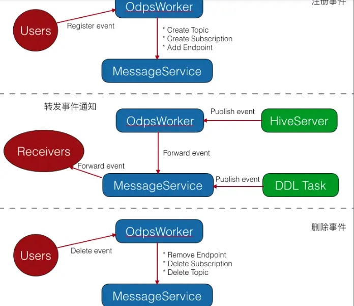 图3-1的三个部分分别表示了注册事件,转发通知,删除事件的过程。MessageService是 MaxCompute 内部消息服务,作用是转发事件通知到用户注册的回调地址。为方便理解,把 Create topic, Create subscription, Add endpoint 看作注册事件在消息服务层的三个操作。事件机制在消息服务层具体的实现将在后边介绍。