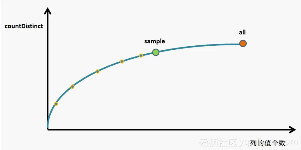 采样比例在1/100后执行时间差距不大,此时最大的消耗在数据读取上,而不针对distinct的计算。