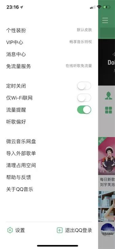 也就是刚才看过的包含三个开关的那张图,它其实是从界面的最左边滑出来的一整个菜单,菜单里是从上到下的列表式布局,每一项都可以点击跳转到下级界面进行选择或者是直接进行开关操作,最下面还有设置界面的入口和退出登录按钮。