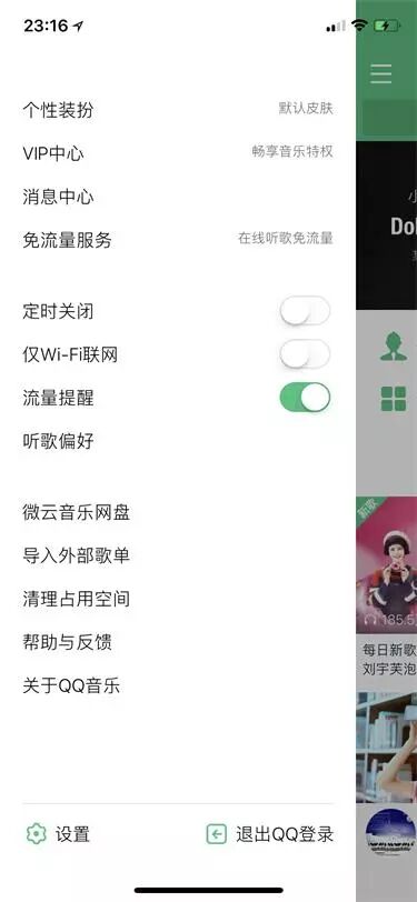 于是你就发现了,QQ 音乐的设计师在界面最左上角放了个三条横线的按钮,点击之后就能展开菜单了。