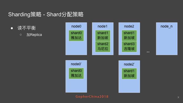 最后的 Shard 分布就是说,比如雅加达是东南亚最大的城市,也是司机数量最多的城市,它现在是独享一组结点。这个配置非常灵活,可以为雅加达配置多个节点。