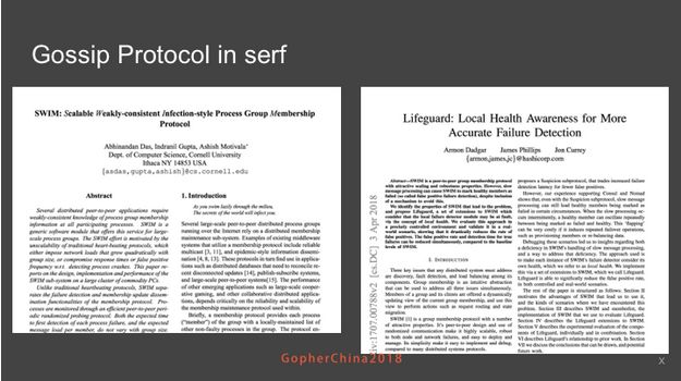 Infection-style, 就是 Gossip,每个结点可以通过 Gossip 其它结点的信息而获得全局信息。还有就是 membership,这个就是讲我们如何找到彼此, 就是信息传播。