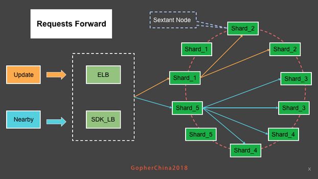 对于"读"来讲,LB 可能会将 Nearby 查询请求打到 Shard_5 所在的节点上,Sextant 同样会发现这个 Nearby 主要发生在 Shard_3、Shard_4,它便会转发Nearby 查询到相应的4个节点(假设是 fanout 模式)并在相应的 Shard 中做 Nearby 查找。