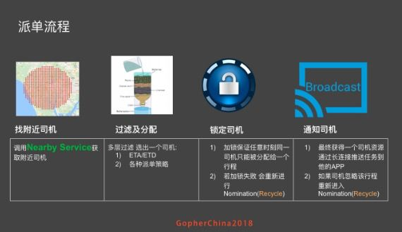从派单流程说起,一个典型的派单流程是什么。首先会查找附近的司机,然后我们有过滤和分配策略,包括 ETA 和 ETD 的计算,以及各种 Allocation 策略, 我们基本上也是很复杂的 RPC 调用,然后锁定司机,通知司机,司机收到并确认就成单了。对于地理服务来说,就是如何找到附近的司机,大家可以看到,这是一个关键路径,如果这个 Nearby 服务 down 了,整个派单流程就全部 down 了。