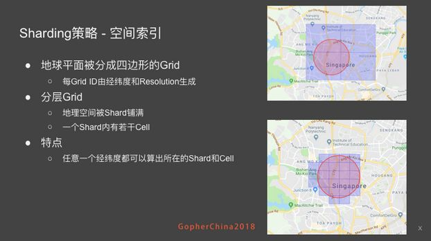 一般想法就是做 Grid,把地球的平面划成格子,每个格子由经纬度以及 Resolution 生成,Resolution 描述的就是格子的尺寸,不同的 Resolution 会生成不同尺寸的格子。我们现在做的是分层的结构,先把地球的平面做一个大的划分,我们叫做 shard,这里面包含有很多个小格子叫做 cell,对于每个司机的位置你都可以计算出在哪个 shard 以及哪个 cell 里面。