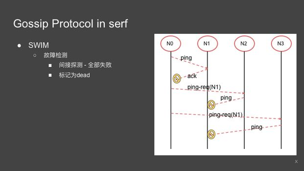 另一个就是如果随机发了几个消息出去,大家都告诉我说它(目标节点)死了,我们就认为它吃饭不想回来了。但是实际上还有一些更好的建议,比如大家都认为一个节点死了的时候不标记为死亡,而是标记为疑似死亡。
